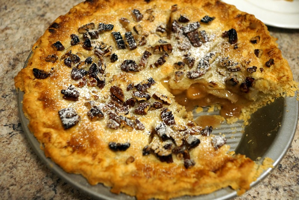 15) Roll out the smaller piece of dough and lay over top. You can even use the leftover egg white to go around the rim of the tin to give the top piece something to stick to. Use the egg yolk wash with milk or water, brush it on the top of the pie. Add chopped pecans (optional) and dust with granulated sugar.