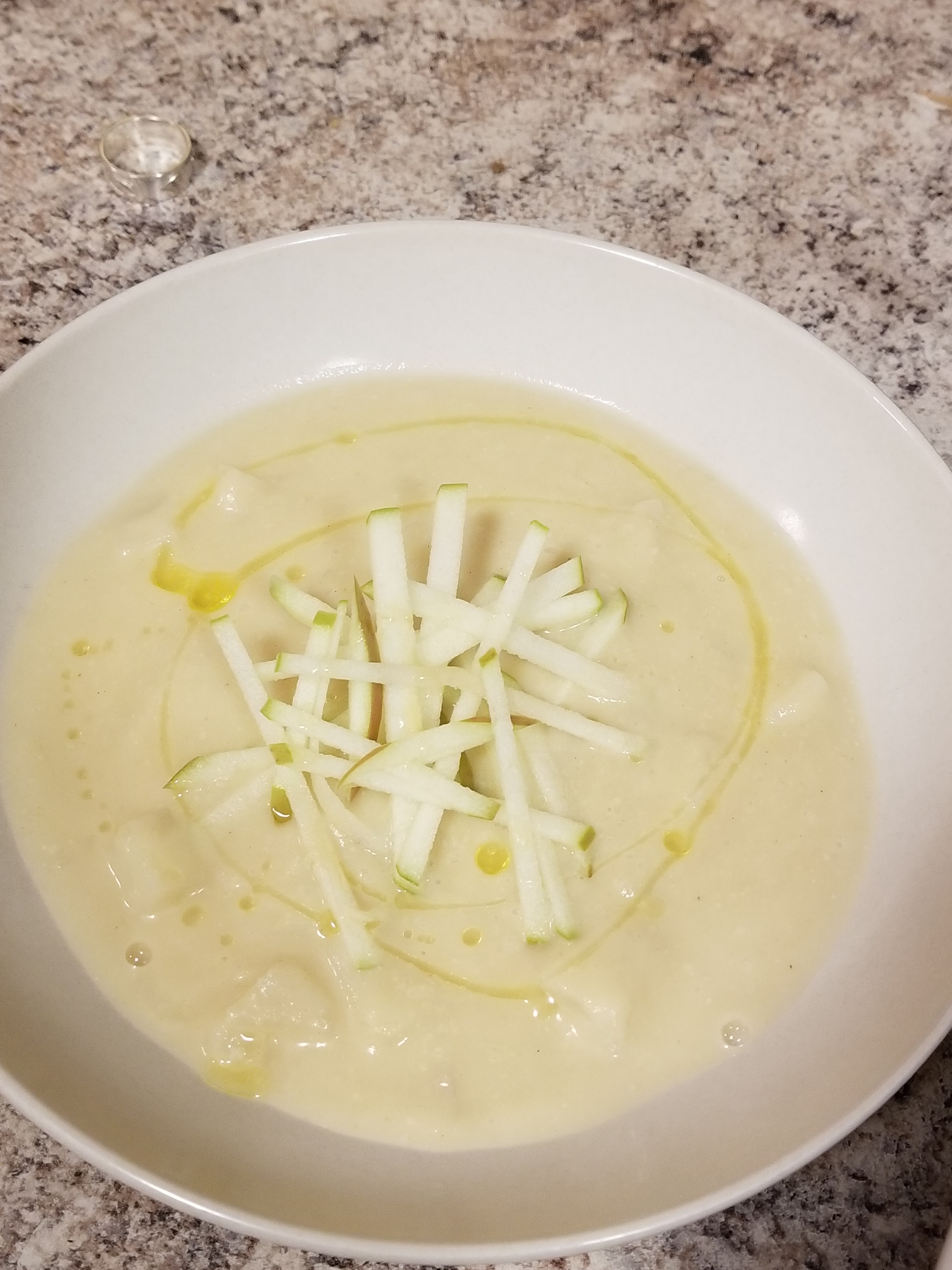 4) Adjust the final seasoning with salt and pepper. I like to garnish this soup with some apple sticks tossed in a splash of lemon juice and a couple of torn thyme leaves. You can swirl some olive oil on top if you feel like being fancy.