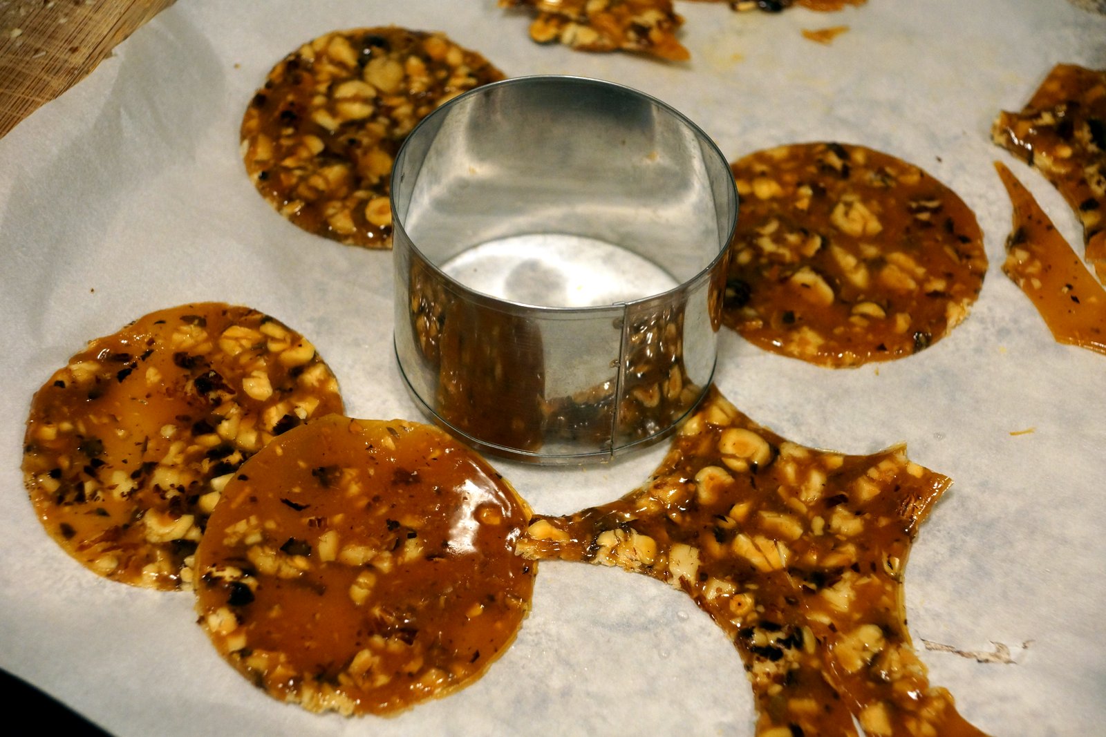 I would have been happy to finish there, but of course I had prepared a dessert. I was thinking of some ‘Italian’ flavours and one of the first thing that popped into my head for desserts was Amaretto, sweet almond liqueur. Who doesn’t love a boozy coffee with Amaretto splashed into it? So I married some Aeropress-brewed coffee and Amaretto into my go-to ice cream base recipe here. For a garnish, I made a quick croquante which is basically a dry caramel that you add a knob of butter into, then at the very end you stir in some chopped nuts (I chose to use hazelnuts). You roll it out in between two sheets of parchment paper and while it’s still hot you can cut out fun shapes. Add a bit of salt to your caramel to bring out the flavour of the nuts more.