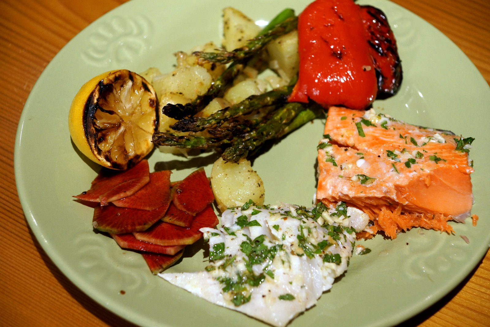 6) I served the fish with a variety of vegetables, including grilled asparagus and peppers, pan fried potatoes, grilled lemon and a simple salad of radishes in balsamic vinegar.
