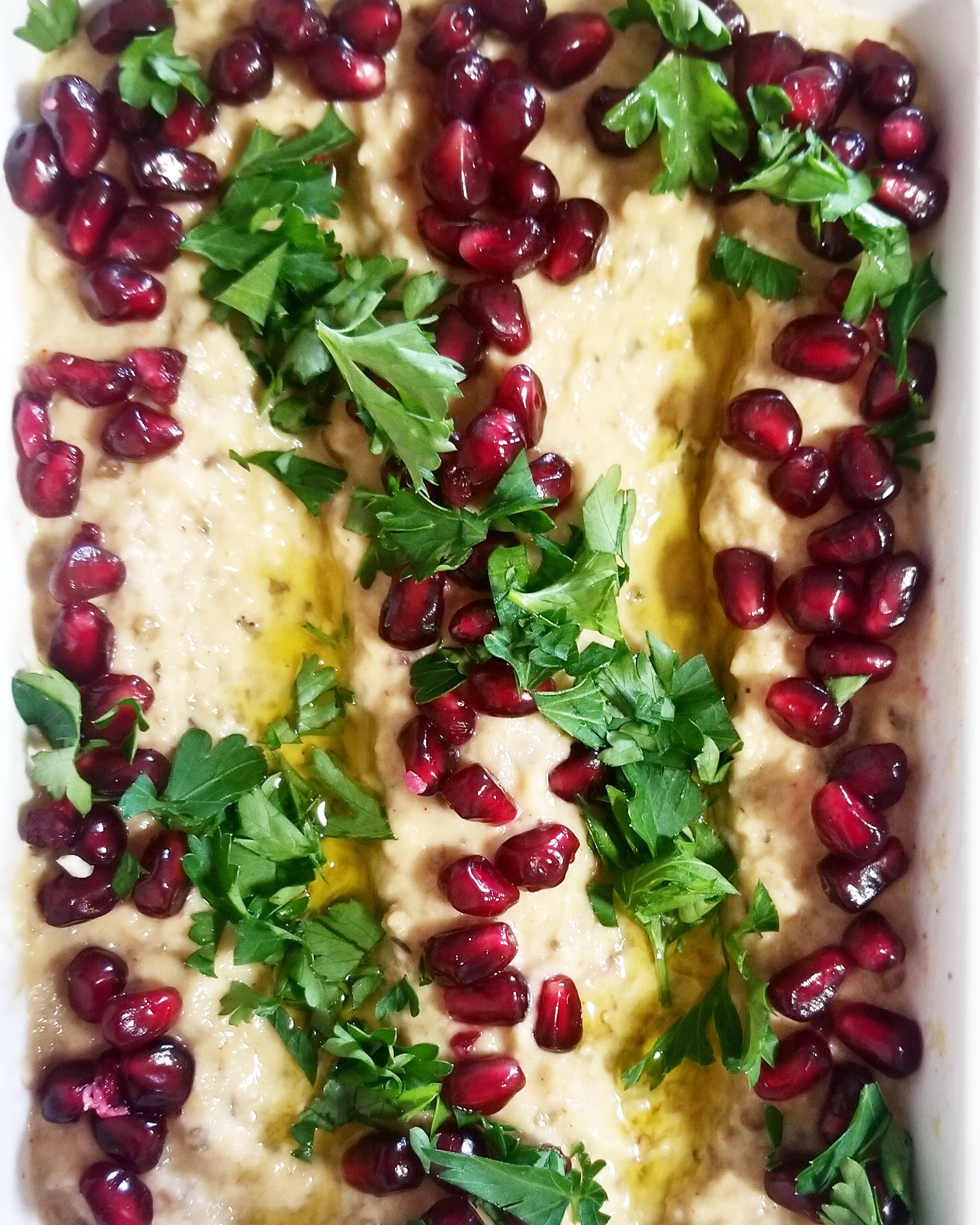 I go over the cooked eggplants with a rough chop but I don’t blend my babaghanouj because I like some texture. Babaghanouj is similar to hummous in a lot of ways in terms of the added ingredients. To your eggplants, you will add a couple of scoops of tahini, the juice of a lemon, a clove of garlic, olive oil and salt. I garnished mine with pomegranate arils and some fresh flat-leaf parsley (Italian parsley). You can use cumin or smoked paprika as additional seasonings if you choose to! This is a great dip/mezze for dipping some pita or veggies into!