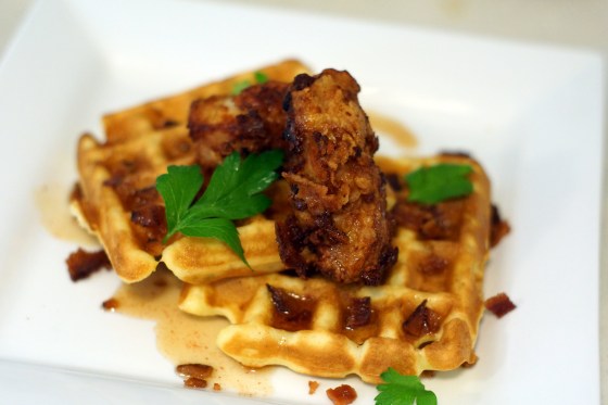 Fried chicken with green onion and cheddar waffles, parsley, bacon bits and chipotle dark maple syrup. The ultimate in salty … More